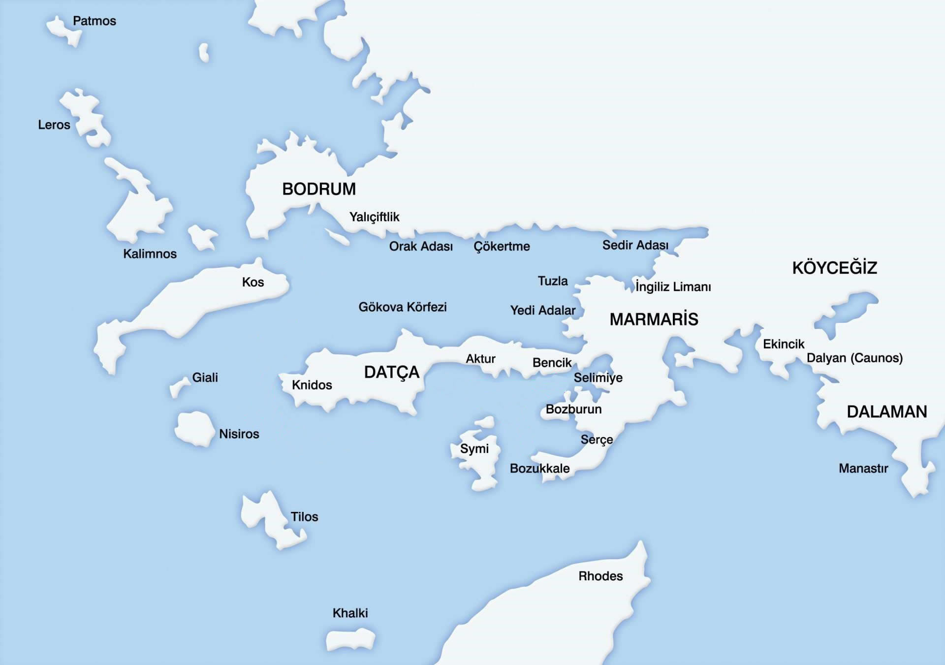 BODRUM – PALAMUTBÜKÜ – İNCEBURUN – AKTUR-BENCİK-EMEL SAYIN KOYU – SELİMİYE – DİRSEKBÜKÜ – BOZBURUN – DATÇA/KNİDOS – KARAADA- POYRAZ LİMANI – METEOR KOYU – BODRUM